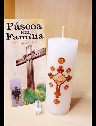 É uma vela adornada com uma cruz, que representa a redenção, também adornado com outros símbolos que remetem a Cristo.