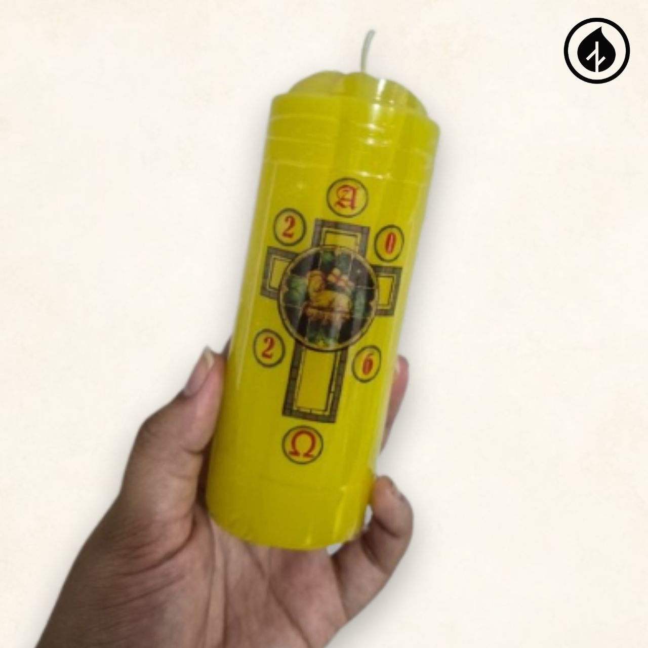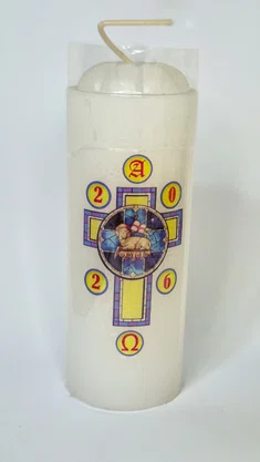 É uma vela adornada com uma cruz, que representa a redenção, também adornado com outros símbolos que remetem a Cristo.