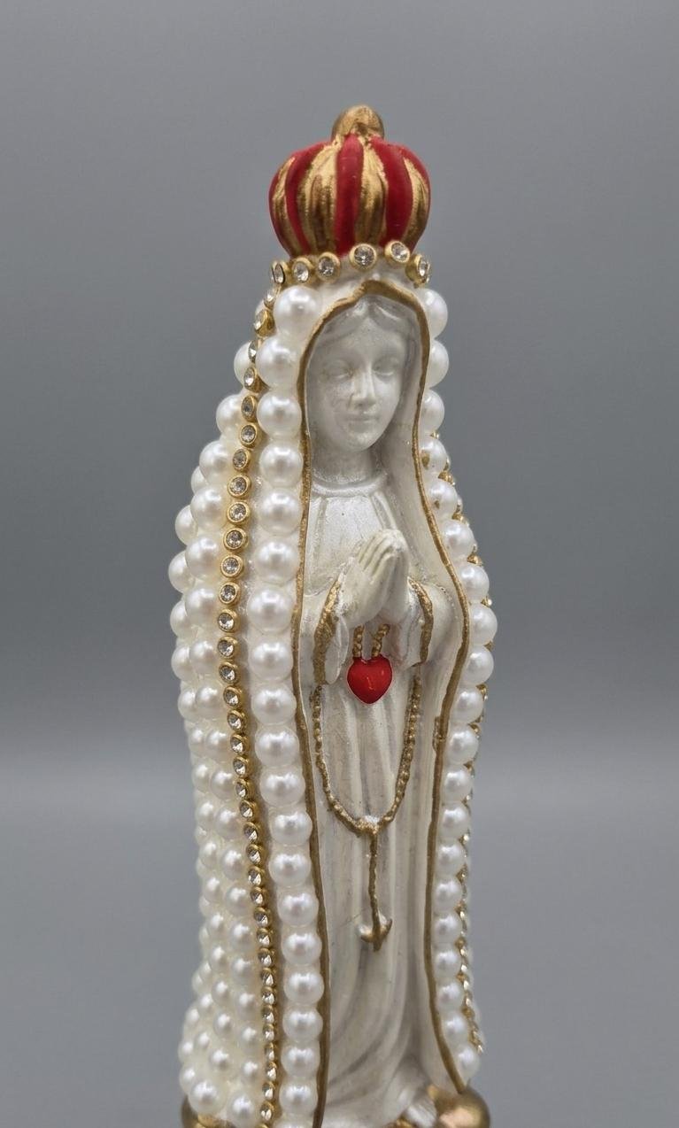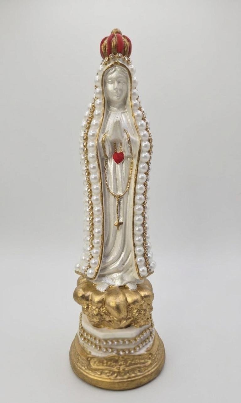 Encante-se com a delicadeza desta imagem de Nossa Senhora de Fátima. Confeccionada em gesso de qualidade, esta peça possui um acabamento rico em detalhes e um manto cuidadosamente trabalhado com aplicação de pérolas, que trazem um brilho suave e um toque de sofisticação à peça.